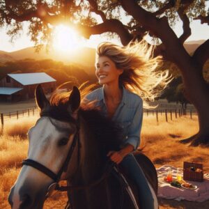 He imagined weekend picnics under oak trees, peaceful trail rides together, and cozy mornings feeding horses before sipping coffee in the barn. Maybe he’d get to wear a cowboy hat. Maybe she’d braid his hair. Romance. Wholesome vibes. Maybe a Jane Austen novel on horseback.
